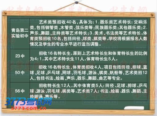 50中面向市北区招收16名特长生,体育类招收4人,项目包括田径、排球、篮球、足球、乒乓球、网球、羽毛球、游泳、棋类 、帆船等,艺术类招12人,包括书法、绘画、声乐、器乐、舞蹈、曲艺等专业。56中确定今年招收特长生 12人,其中体育类 5人:田径、足球、排球、乒乓球、游泳、羽毛球、棋类等。艺术类 7人:书法、绘画、器乐、舞蹈 、主持朗诵、声乐等。招收范围须是市北区在籍、在校就读的应届小学毕业生。