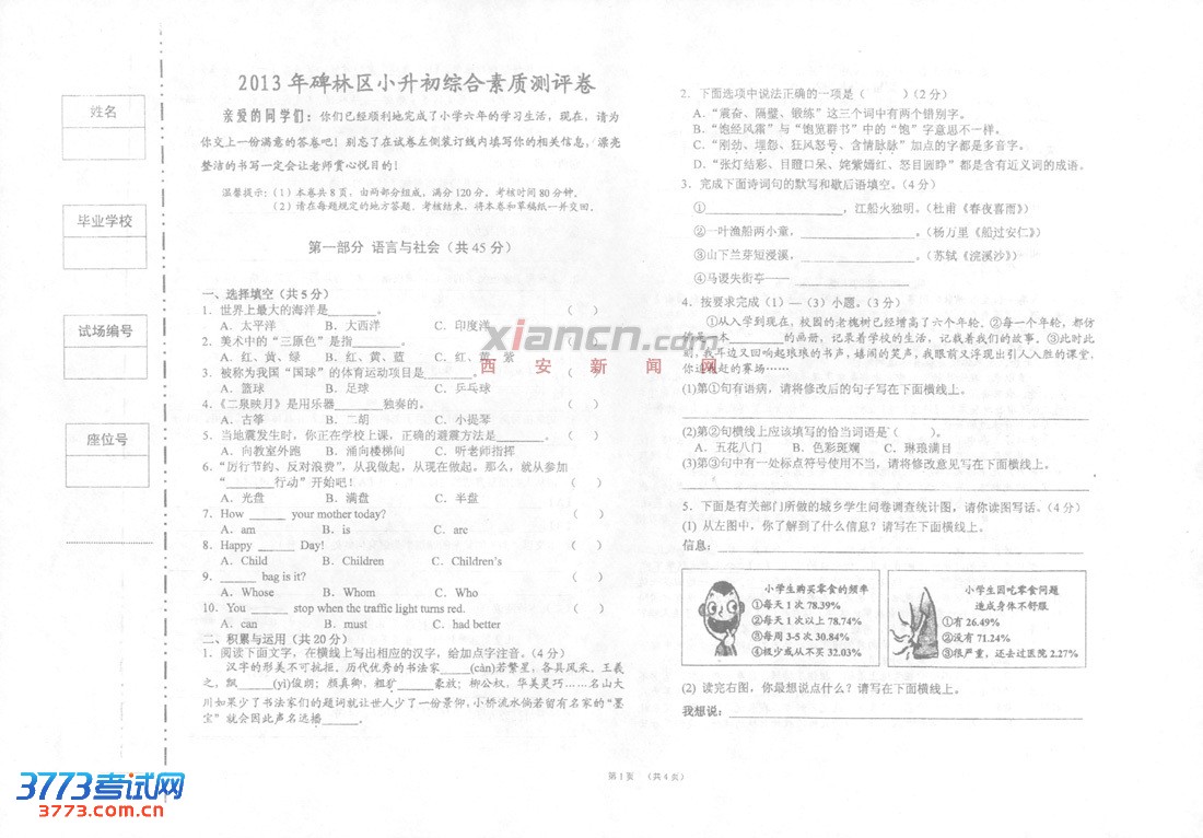 2013年西安小升初西工大附中分校全面素质评价考核试卷