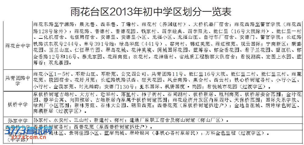 新华报业网讯 昨天,雨花台区2013年小学初中招生办法出台。6月初该区各小学将在学校门口公示栏、校园网及其学区范围内醒目位置公布招生公告,告知辖区家长具体学区范围、招生时间、招生要求;公办初中学区已经划定(详见表格),雨花台中学招收20名特长生。