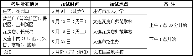 工作时间:上午:8:30—11:00,下午:1:00——3:00.四、如有个别考生在规定的日期、时间内没有参加招生学校组织的加试、面试,在考生填报志愿前和招生学校联系补加试、面试。五、各校招生学校以大连市《中招考试信息报》公布的招生专业和计划填报志愿。请招生部门将本通知发到初中学校,初中学校必须指定专人负责此项工作
