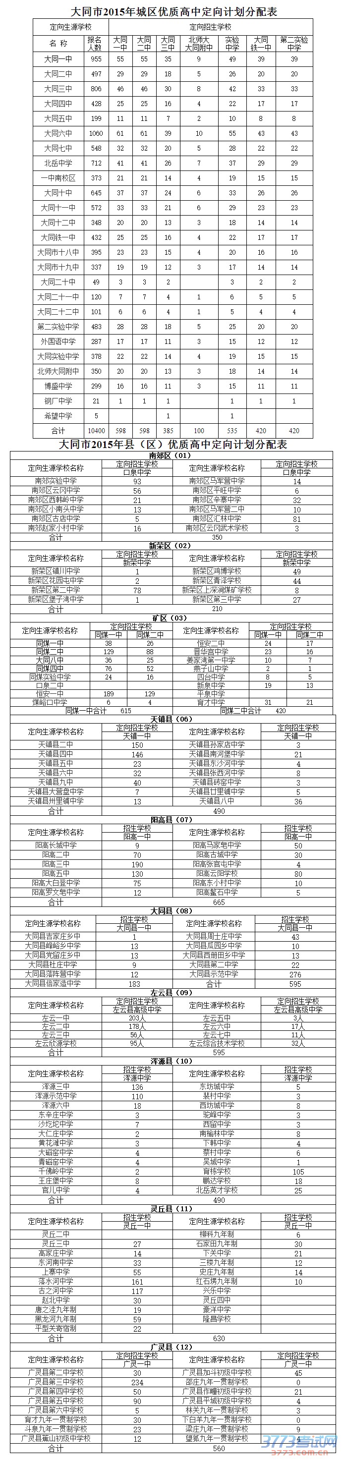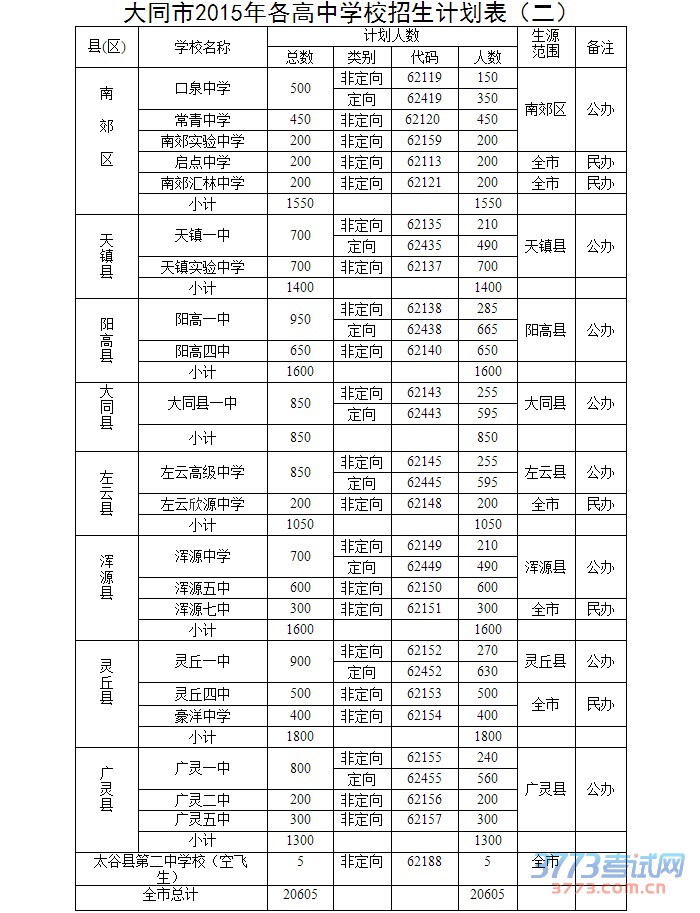 大同市2015年高中学校招生计划