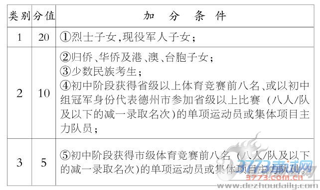 加分条件:应届初中毕业生方能按下表所列条件加分;表中所说 “市级”均指 “德州市级”,县级和其他地市证明暂不予采信;同时符合两个及以上条件的,只按最高类别的一条加分;若有虚假申请,一经查实,取消其考试资格或录取资格。