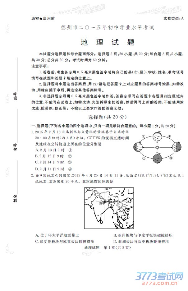 及时公布山东中考试题、答案和中考作文。祝各位考生都能取得好的成绩。2015年山东德州中考地理试题(图片版):