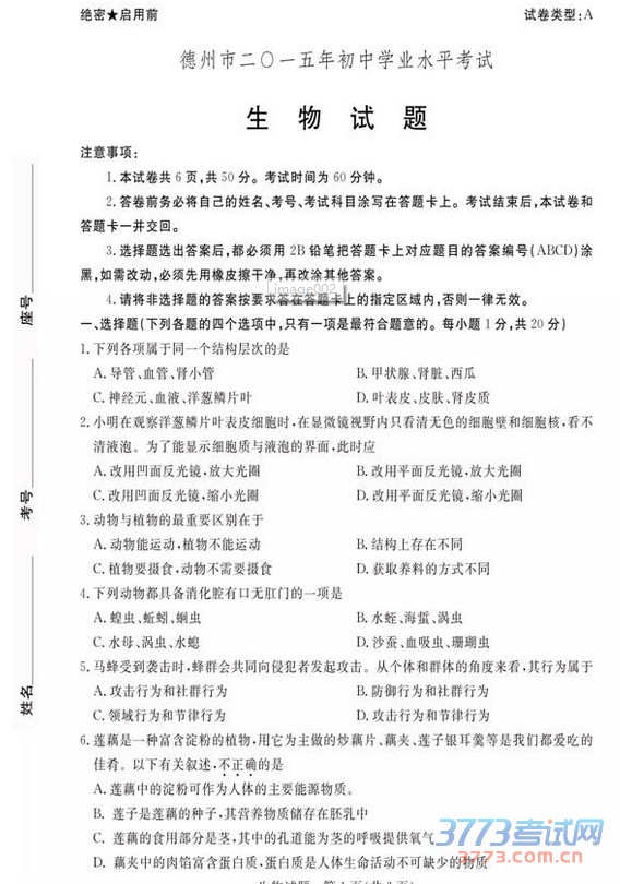 公布山东中考试题、答案和中考作文。祝各位考生都能取得好的成绩。2015年山东德州中考生物试题(图片版):