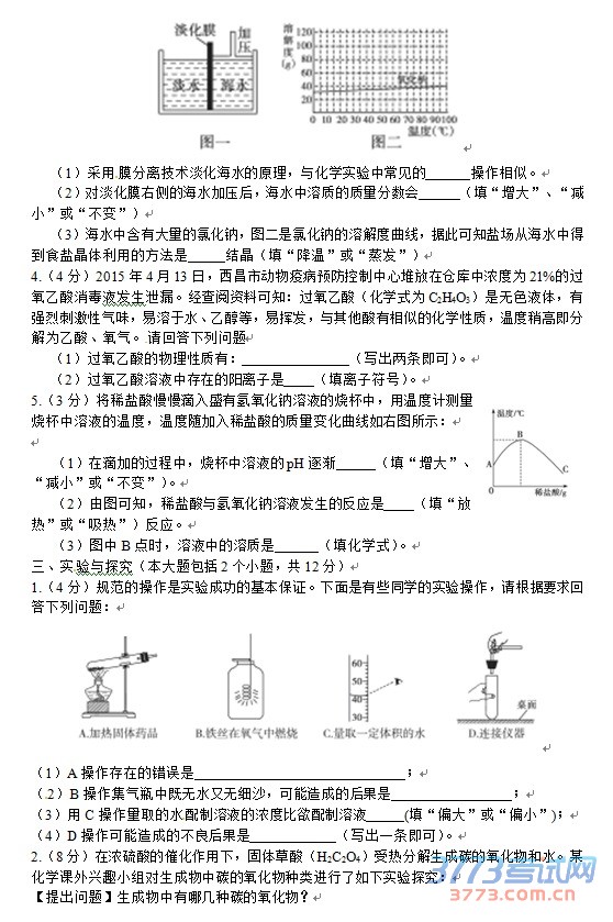 4.(4分)2015年4月13日,西昌市动物疫病预防控制中心堆放在仓库中浓度为21%的过氧乙酸消毒液发生泄漏。经查阅资料可知:过氧乙酸(化学式为C2H4O3)是无色液体,有强烈刺激性气味,易溶于水、乙醇等,易挥发,与其他酸有相似的化学性质,温度稍高即分解为乙酸、氧气。 请回答下列问题