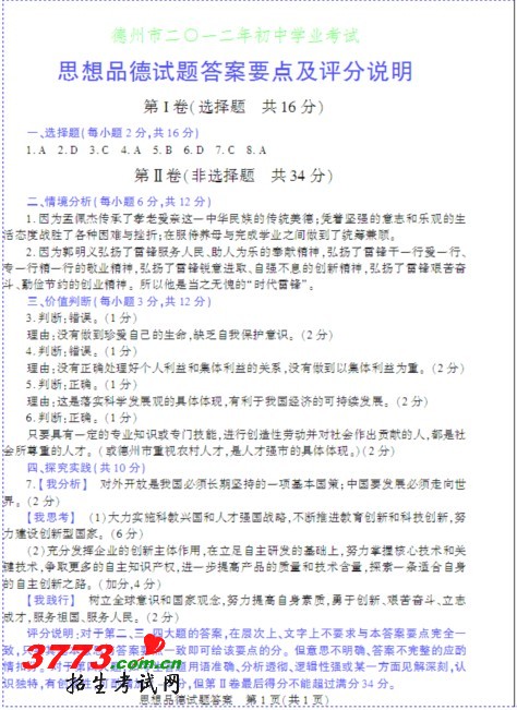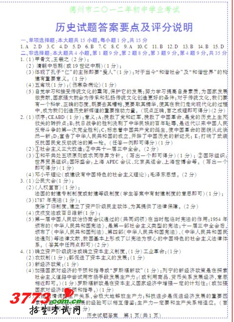 [组图]2012年德州中考历史思想品德试题及答案标准