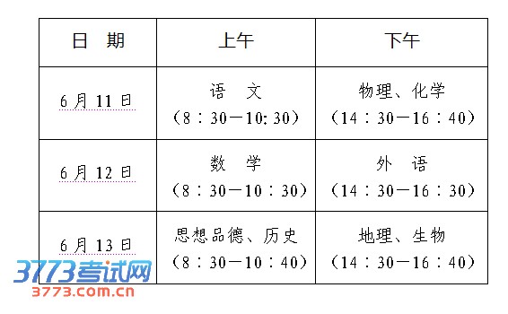 2013年初中学生学业水平考试科目及时间安排