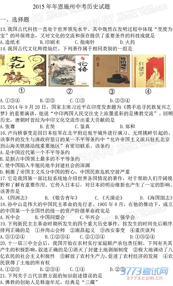 公布中考试题、答案和中考作文。祝各位考生都能取得好的成绩。2015年湖北恩施中考历史试题(图片版):