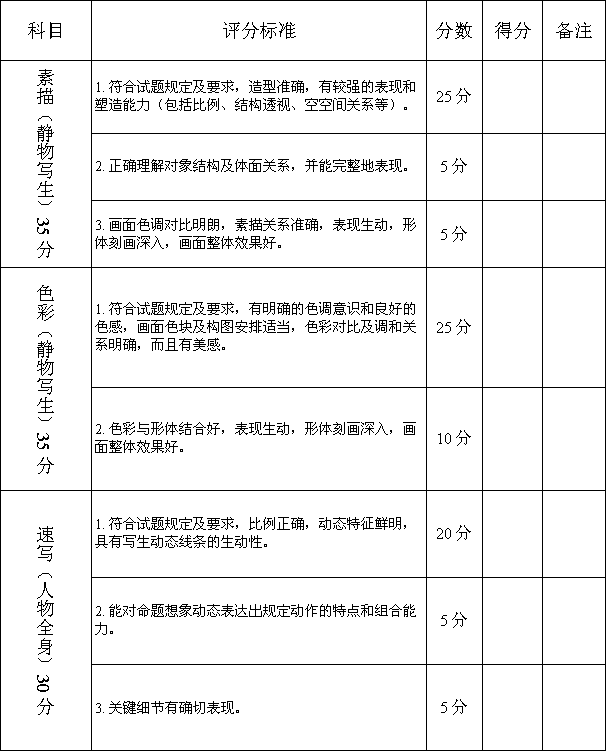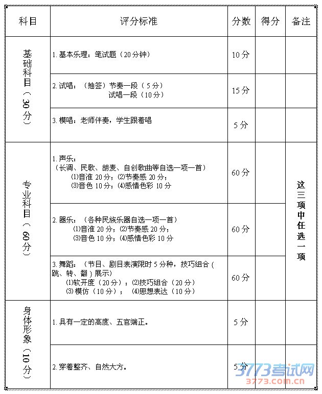 六、专业测试项目及分值分配 :见附件(音、体、美特长生测试办法:测试项目、内容、评分标准)