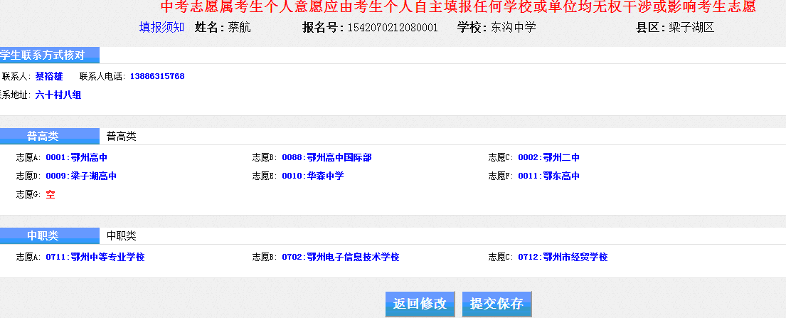 7.考生在网上填报系统中要认真填写本人的联系电话和录取通知书送达地址,这是考生网上录取电子档案信息中的重要部分。主要用于录取期间招生部门或招生学校与考生联系,用于招生学校送达录取通知书。如果考生不填写或填写不准确,可能会影响录取,录取后无法送达录取通知书。所以请考生和家长一定要认识到填写本人通讯方式和录取通知书送达地址的重要性,一定要按网上填报志愿系统的要求,认真、准确、完整地填写,并确保在录取期间所填电话的畅通。