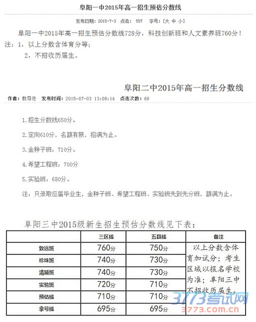 2015阜阳一中阜阳二中阜阳三中分数线