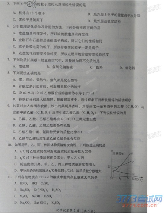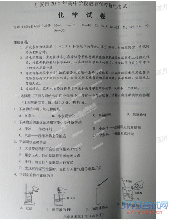 及时公布南充中考试题、答案和中考作文。祝各位考生都能取得好的成绩。2015四川广安市中考化学试题: