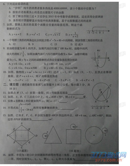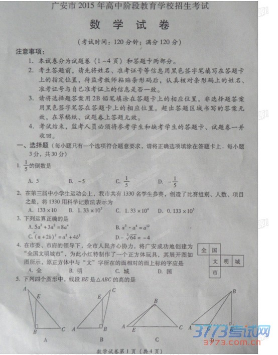 公布广安中考试题、答案和中考作文。祝各位考生都能取得好的成绩。2015四川广安市中考数学试题: