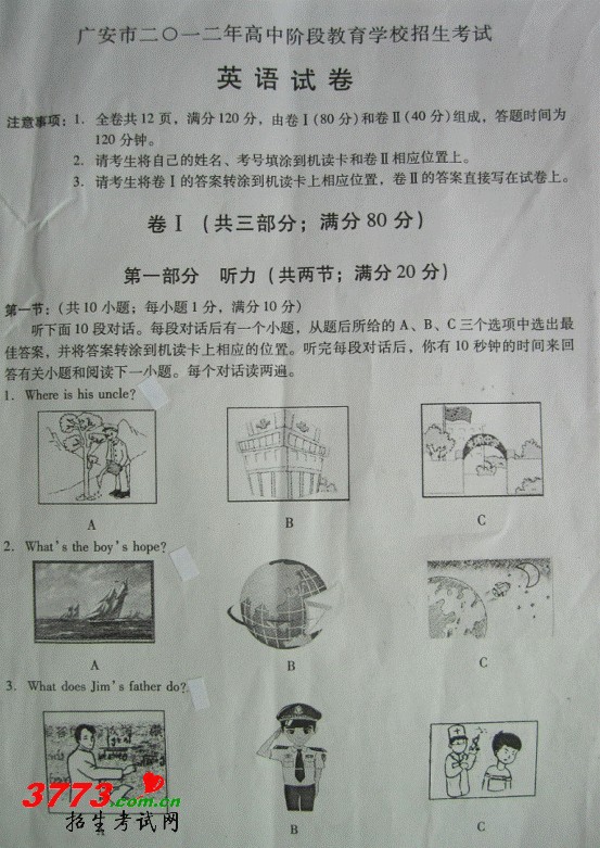 四川广安2012年中考英语试卷及答案,2012年中考试题及答案已陆续公布