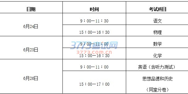 九年级语文科为150分钟,数学科、英语科、思想品德与历史(同堂分卷)均为120分钟,物理科、化学科均为90分钟。统一安排在6月24日、25日、26日进行。