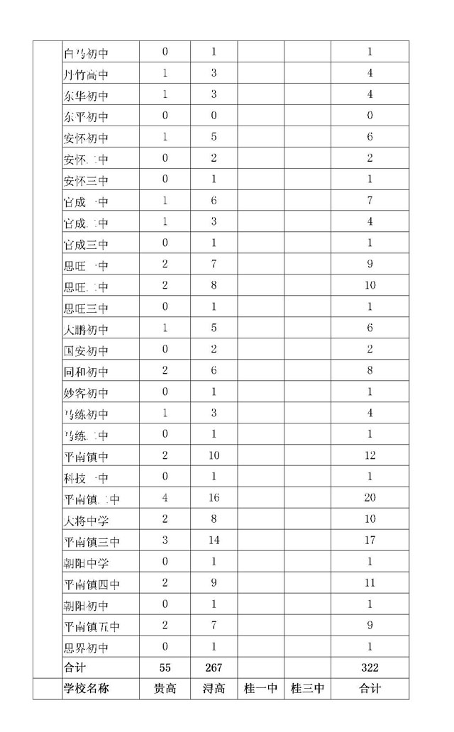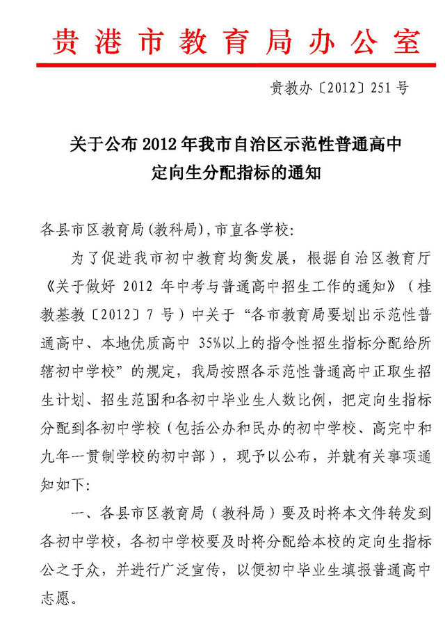 [组图]关于公布2012年贵港普通高中定向生分配指标的通知