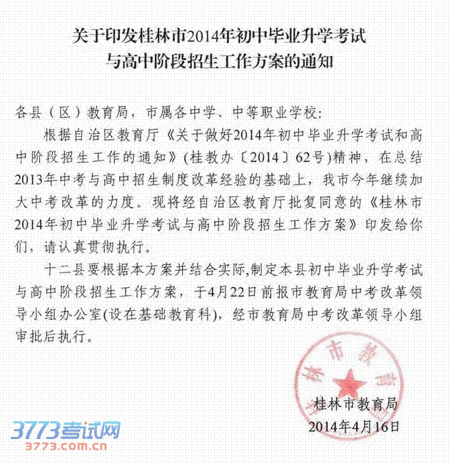 关于印发桂林市2014年初中毕业升学考试与高中阶段招生工作方案的通知