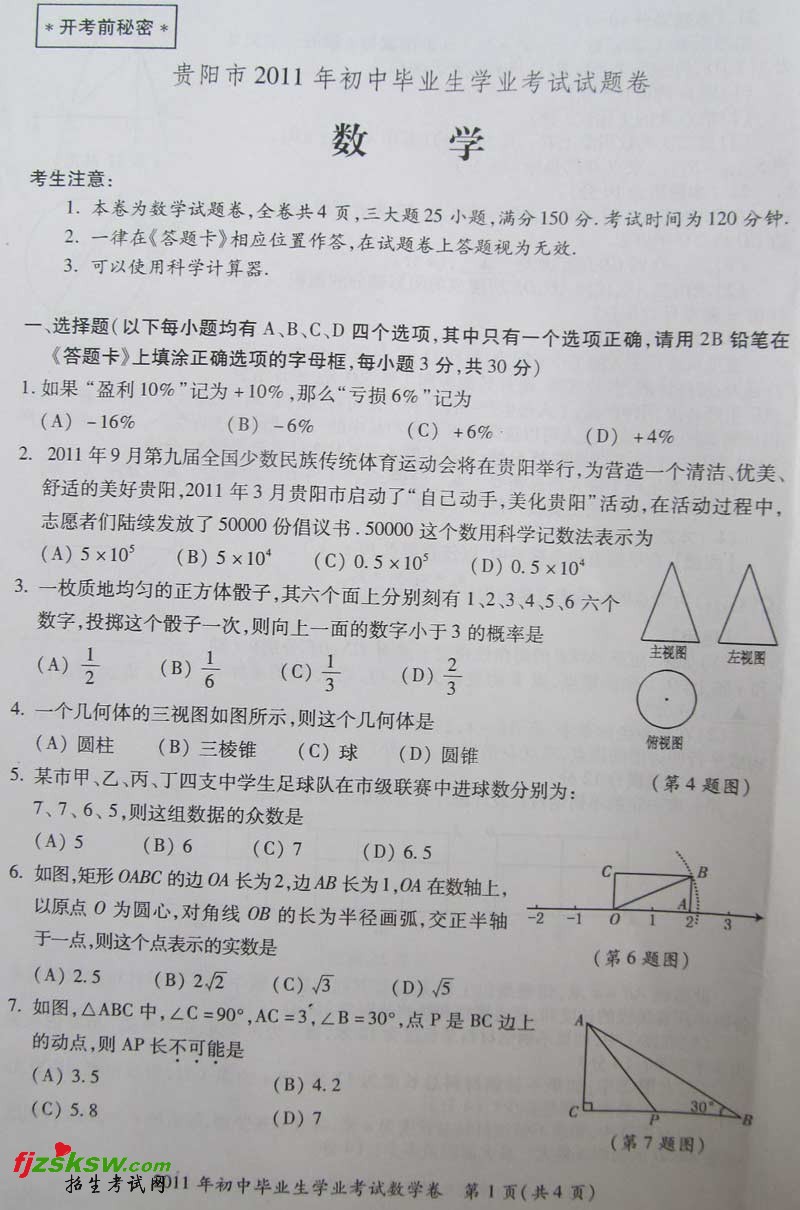 [组图]贵州贵阳2011中考数学试题及答案