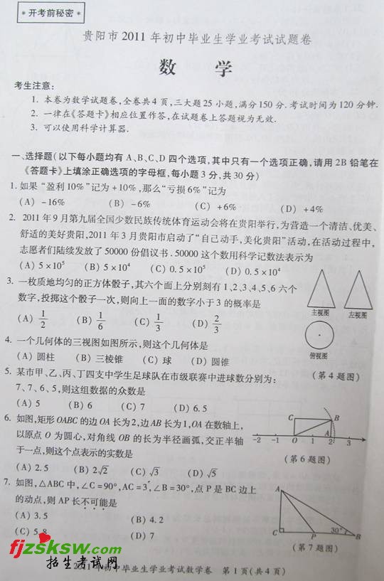 [组图]贵阳2011中考数学试题试卷及参考答案