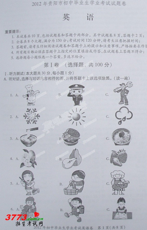 [组图]2012年贵阳中考英语试题及答案