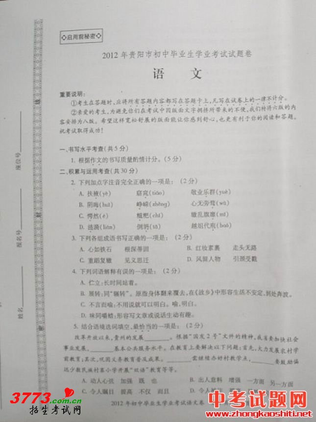 2012贵阳中考语文答案 贵阳市中考语文试卷试题答案