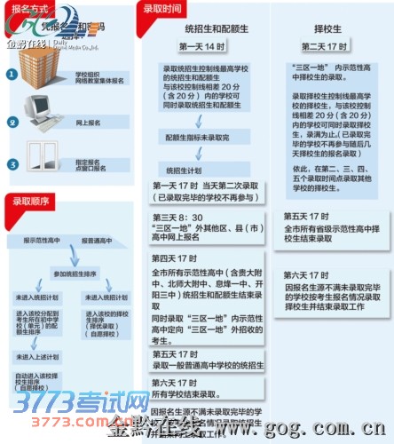 第一、二天只限“三区一地”普通高中学校接受辖区考生报名。从第三天起,各区、县(市)普通高中学校面向本地区招收的考生,同时,各区、县(市)省级示范性高中面向全市招收的考生。