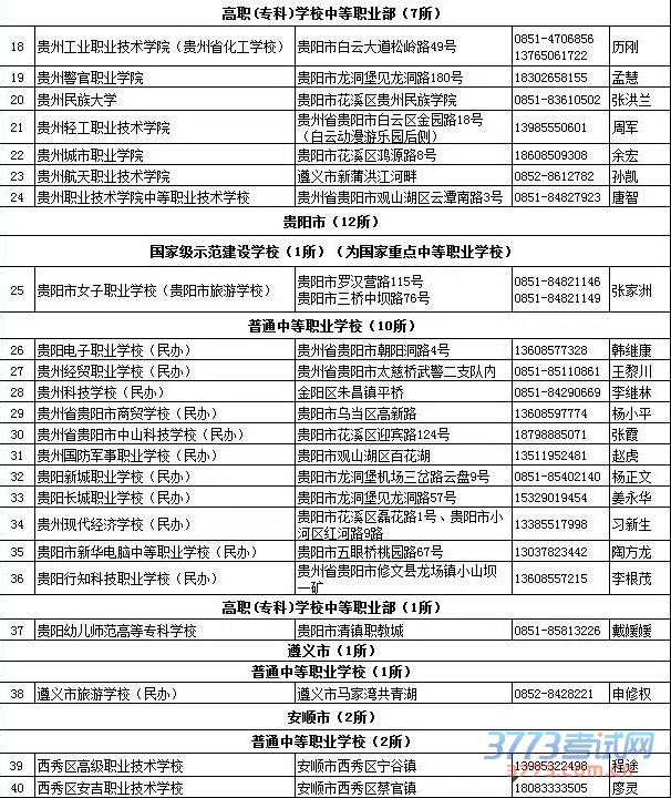 二、(市)州所属中等职业学校18所。贵阳市所属中职学校13所,其中:国家级重点中等职业学校1所(同时为国家级示范建设学校),普通中等职业学校11所,高职(专科)学校所属中等职业部1所;遵义市所属普通中职学校1所;安顺市所属普通中职学校2所;黔南州所属普通中职学校1所,高职(专科)学校所属中等职业部1所。