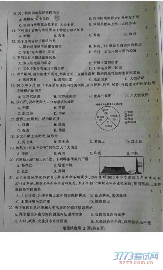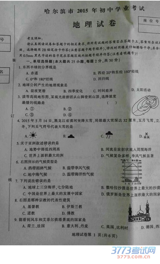 [组图]2015哈尔滨中考会考地理试题及答案公布