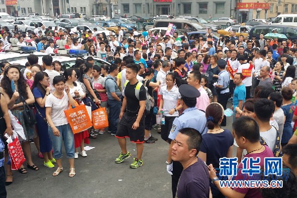 哈尔滨市第十三中学门口送考的家长。新华网黑龙江频道张弘典 摄