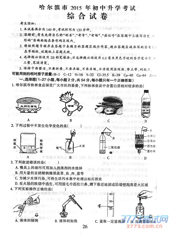 及时公布中考试题、答案和中考作文。祝各位考生都能取得好的成绩。2015年哈尔滨中考理综试题及答案: