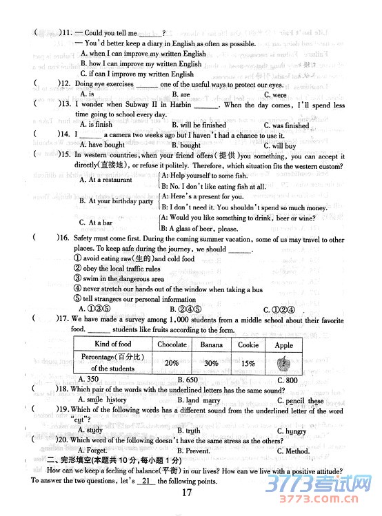 [组图]2015哈尔滨中考英语试题及答案评分标准