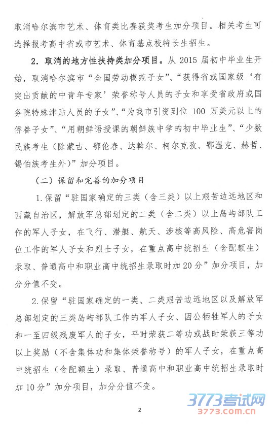 哈尔滨市招生考试委员会关于印发《关于调整我市中等学校招生加分政策的意见》的通知