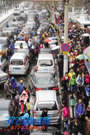 14日,南岗区中实学校门口,家长冒雪接考试学生。