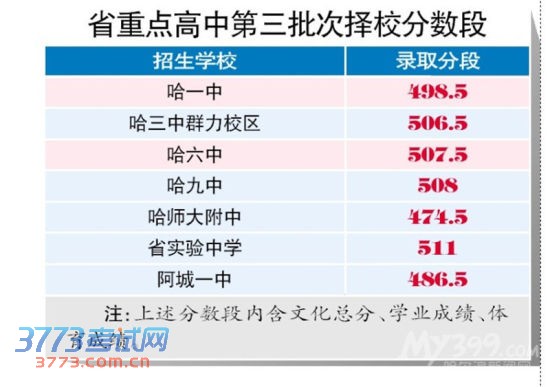 各省重点高中三批择校分段为:哈一中498.5、哈三中群力校区506.5、哈六中507.5、哈九中508、哈师大附中474.5、省实验中学511、阿城一中486.5。上述分段内含文化总分、学业成绩、体育成绩。