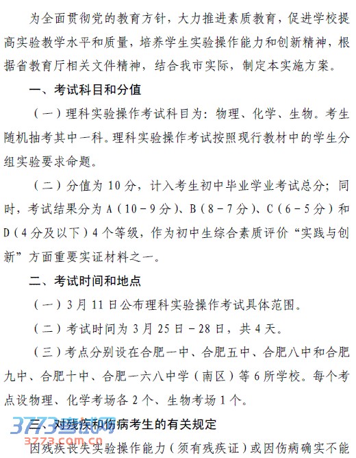 为全面贯彻党的教育方针,大力推进素质教育,根据省教育厅相关精神,制定了《2014年合肥市市区初中毕业学业理科实验操作考试实施方案》,现印发你们,请遵照执行。