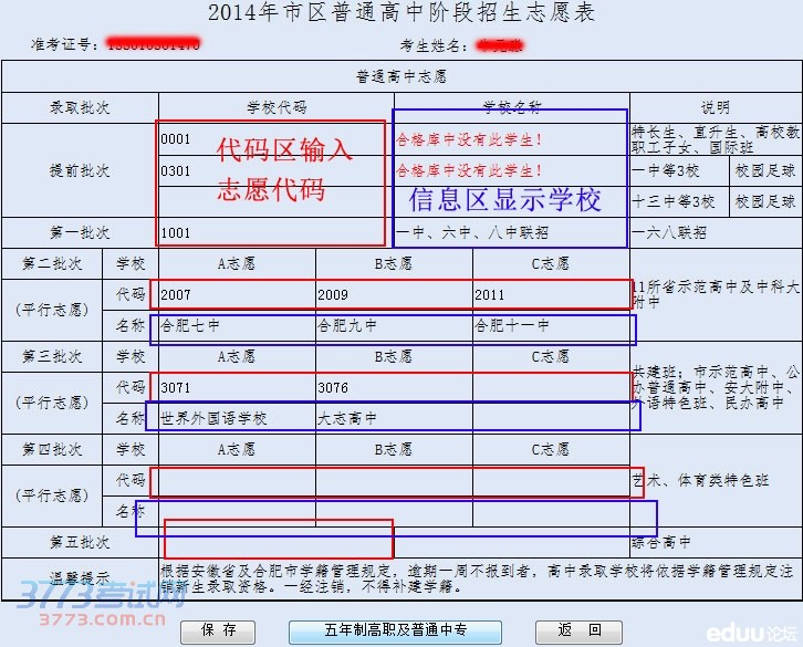 2) 注意:考生填报志愿信息不合法,系统将以红色字体显示考生填报的志愿或提示,表示有误。考生须检查输入数据是否合法代码(普通高中招生代码为4位),查看是否符合招生政策后重新填写正确,否则不能保存。