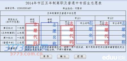 考生一定要注意系统给出的红色信息提示,检查自己填报的志愿是否符合招生政策和输入数据是否合法(普通高中招生代码为4位,五年制高职及普通中专代码为3位,专业代号2位,以及输入的院校代号是否存在),及时改正错误的志愿信息,否则志愿信息无法保存。