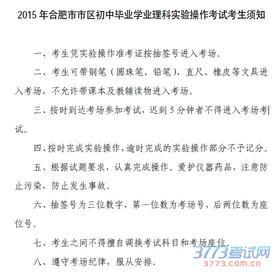 2015 年合肥市市区初中毕业学业理科实验操作考试考生须知