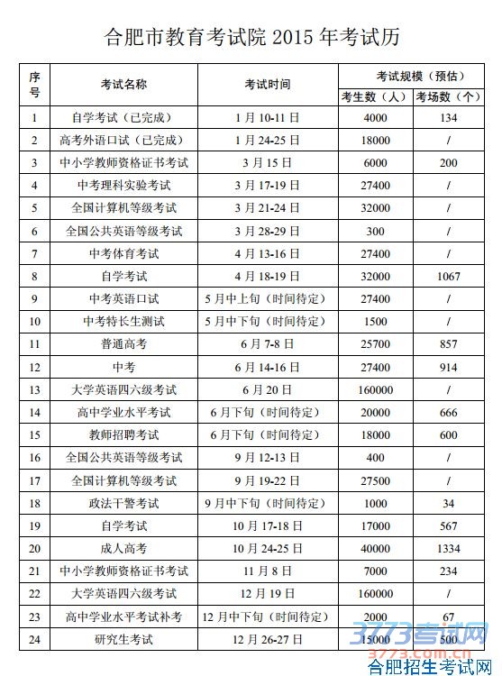 现将《合肥市教育考试院2015年考试历》印发给你们(如有变化另行通知),请据此安排相关工作。市区各标准化考点学校主要承担普通高考、中考、自学考试、成人高考、研究生考试和高中学业水平测试等考试任务,届时须服从合肥市教育考试院统一安排。