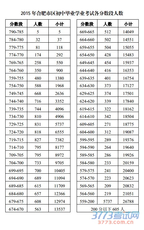 2015 年合肥市区初中毕业学业考试各分数段人数