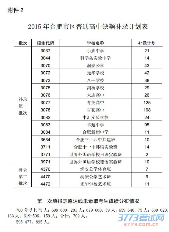 2015 年合肥市区普通高中缺额补录计划表