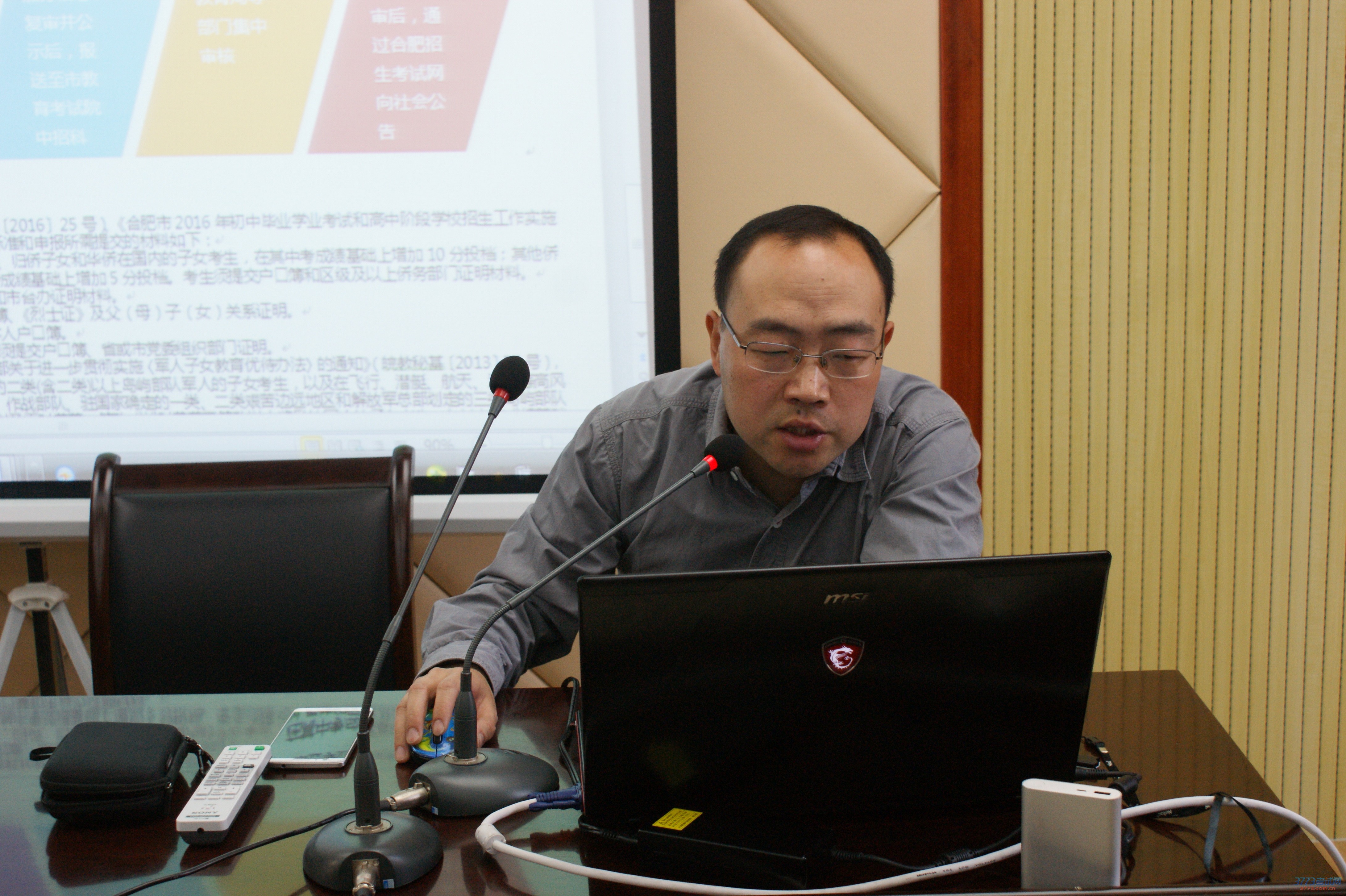 考试院陈毅红副院长主持会议,首先由技术专家给参会人员就提前批次报名软件进行了培训;考试院中招科曾嵘科长分别就省示范高中特长生(校园足球定点学校)招生报名工作、指标到校审查工作、政策加分审查工作进行了详细说明,并对中考后续工作进行布置。其中合肥一中、六中、八中特长生及校园足球定点学校报名工作5月12-13日进行, 5月21-22日进行专业测试。