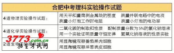 昨天上午,合肥市教育招生考试院公布了今年中考理科实验操作试题,其中物理实验题4道,化学实验题4道,生物实验题2道。从公布的试题来看,实验操作以基础知识为主,难度不大。考生将在考试入场前抽签,根据抽签情况决定实验考试内容,每个考生只需进行一个实验的考试,考试时间为20分钟。