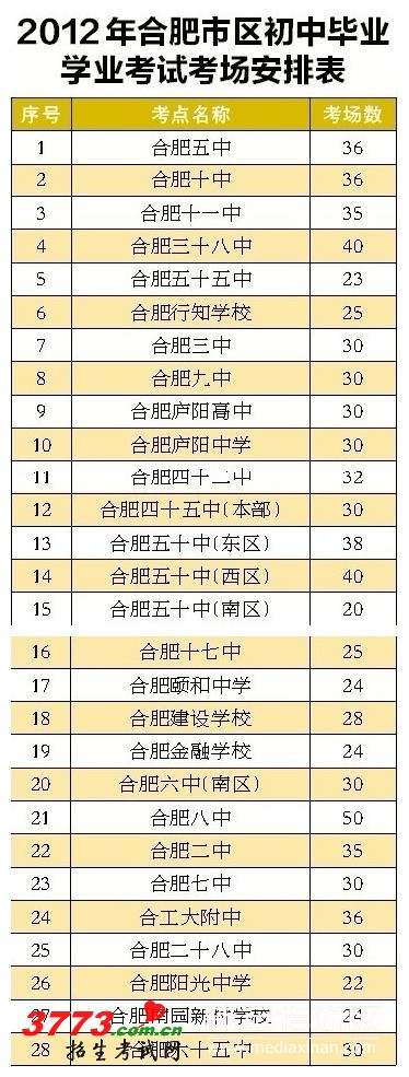 昨日,合肥市教育考试院公布了今年中考市区28个考点的名单。据悉,今年合肥市共有中考考生85293人报名,其中市区共有25829人,比上年减少650人。
