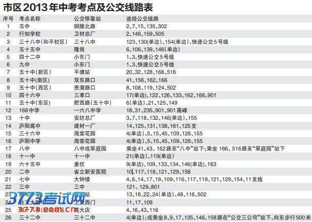 昨日,合肥市中考考点也随着高考考点一并公布。2013年,合肥市共有中考生77898人,比去年减少7395人,全市共设66个考点,2603个考场。其中市区共有考生25625人,共安排26个考点,856个考场。这些考点和高考考点一样,同样实现视频全监控。