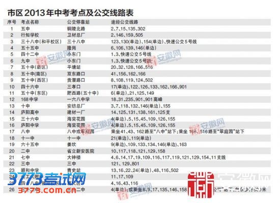 昨日,合肥市中考考点也随着高考考点一并公布。2013年,合肥市共有中考生77898人,比去年减少7395人,全市共设66个考点,2603个考场。其中市区共有考生25625人,共安排26个考点,856个考场。这些考点和高考考点一样,同样实现视频全监控。