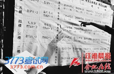 考场外面设有考场安排表,一名考生通过准考证查询自己所在的考场。