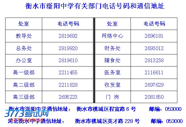 衡水市滏阳中学有关部门电话号码和通信地址