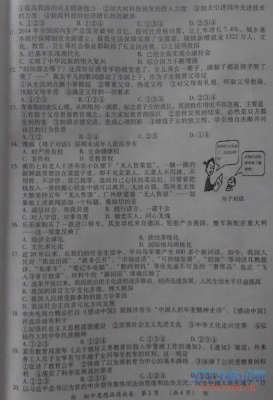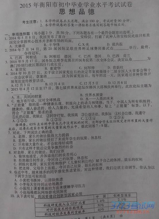 公布中考试题、答案和中考作文。祝各位考生都能取得好的成绩。湖南省衡阳市2015年中考政治试题: