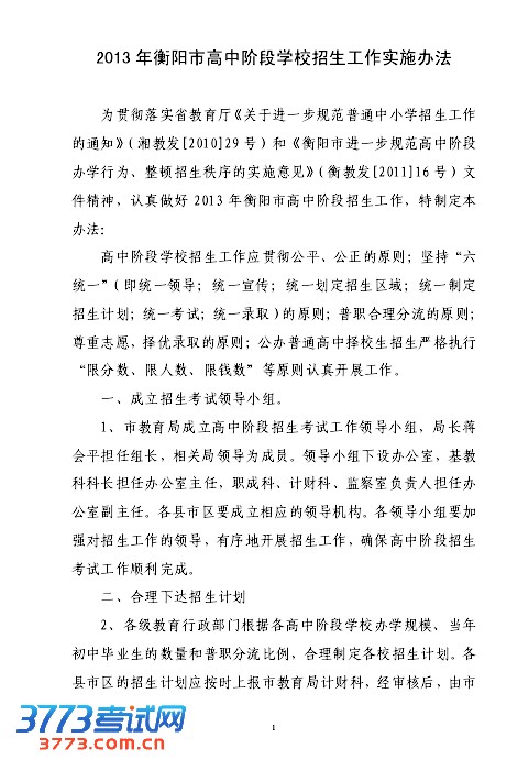 关于印发《2013年衡阳市高中阶段学校招生工作实施办法》的通知